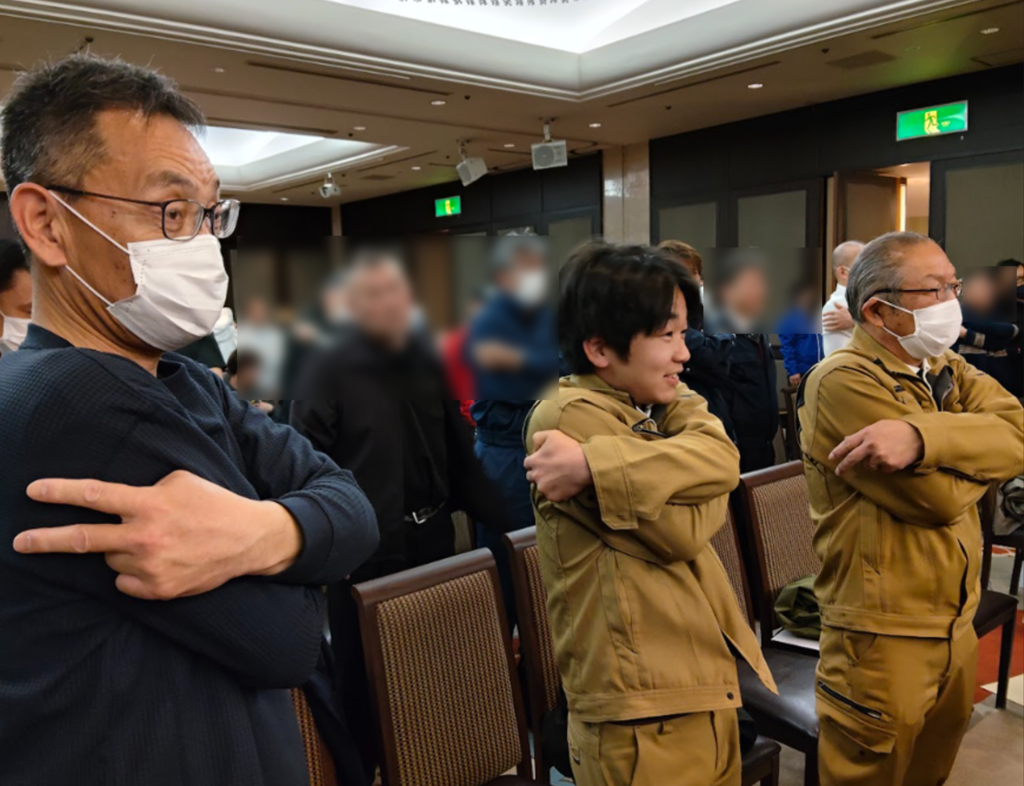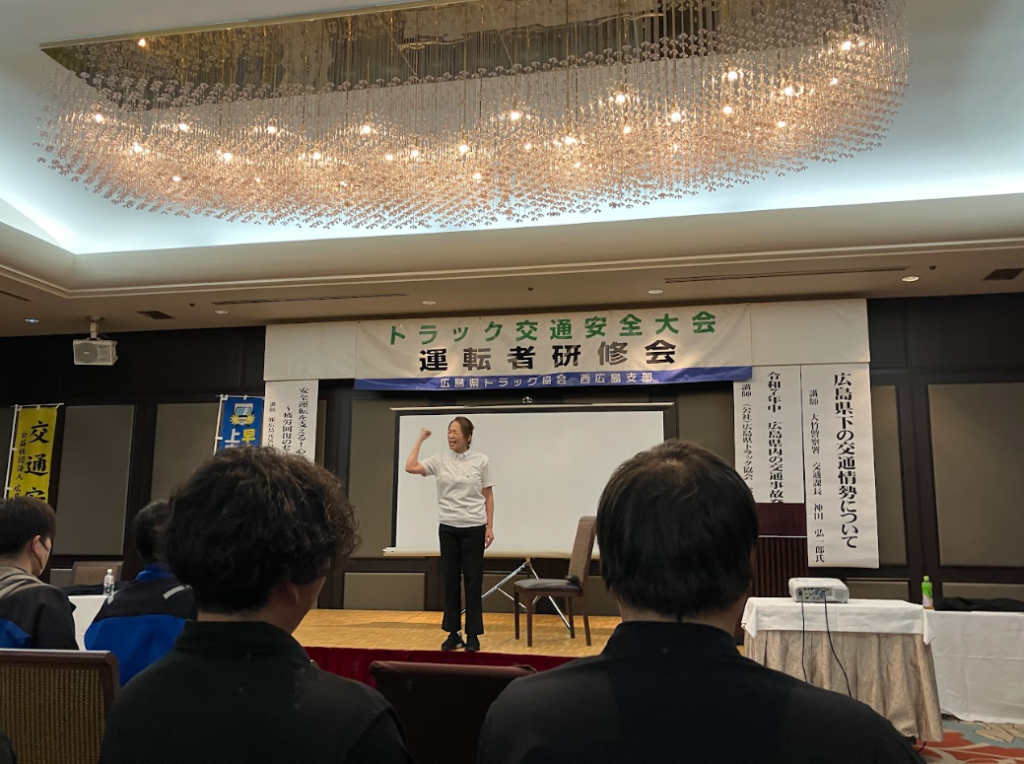 後半には広島元気いっぱいプロジェクト代表取締役岩崎浩美氏による「安全運転を支える!心身のリフレッシュ」講演内で、疲労回復のセルフケアと集中力アップ術を実演とともに参加者全員で体感致しました。