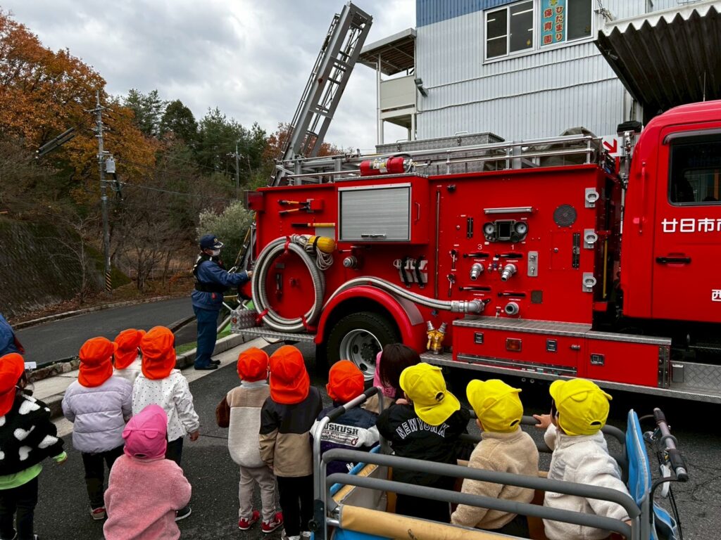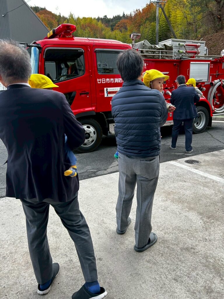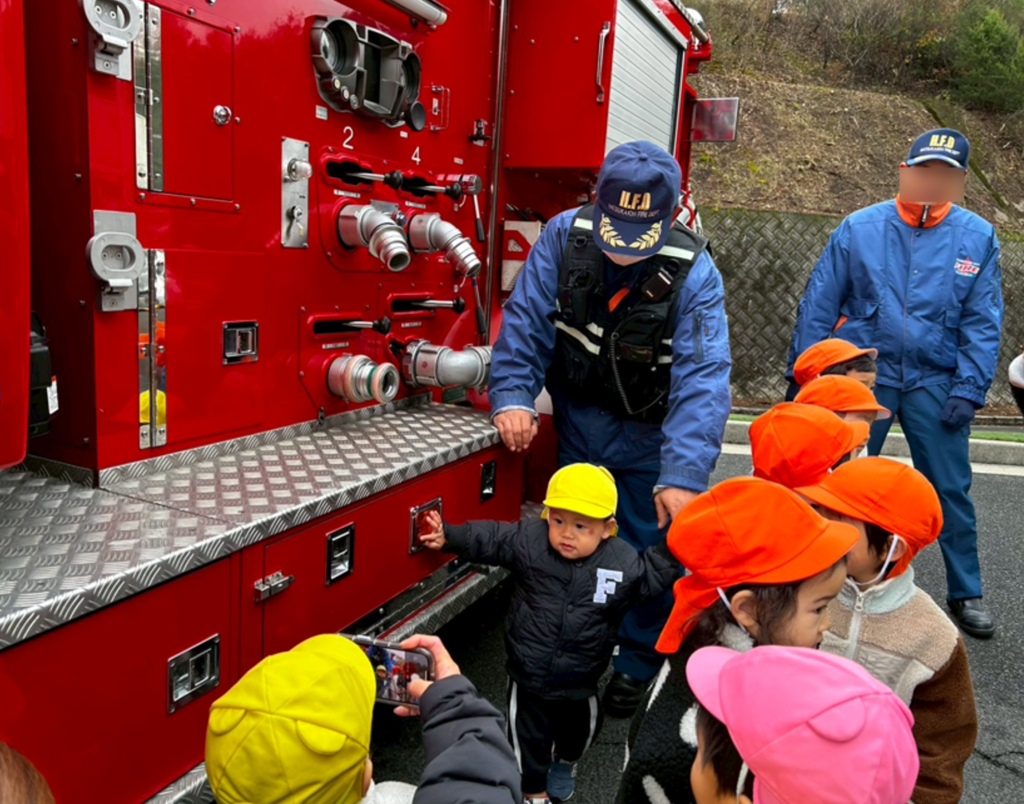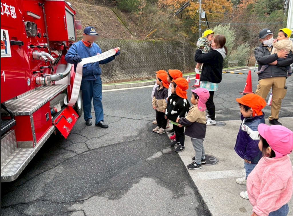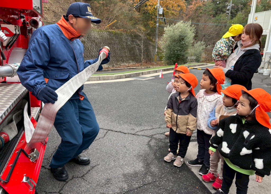 「煙を吸ってはいけませんよ」という保育園の先生の教えのとおり、小さな手で自らの口を押さえている場面に純真無垢さを感じつつも、みんな真剣な眼差しで消防士さんのお話を聞いています。消防訓練の重要性を肌で感じ取っているようですね。