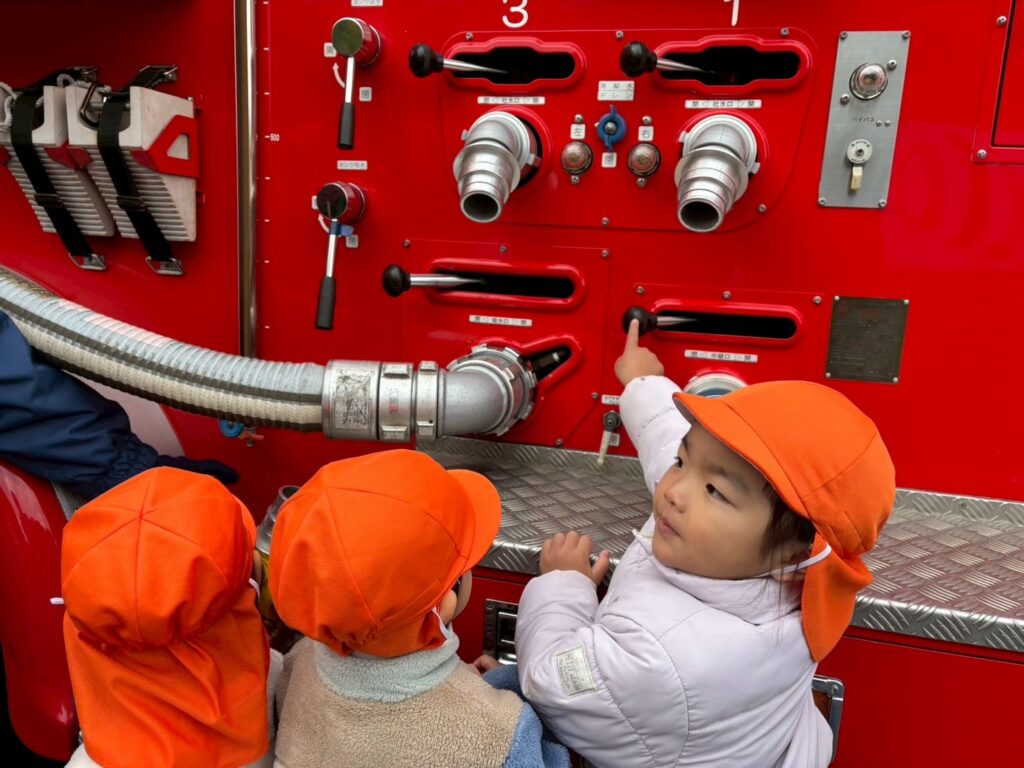 消防訓練の後は、消防車についての説明です。消防士さんも終始穏やかな表情で保育園児さんたちと接して下さり、全身から優しさが溢れていました。
