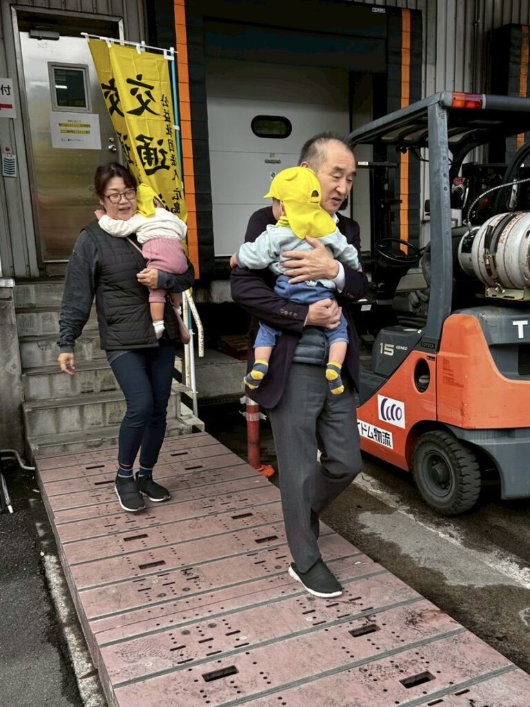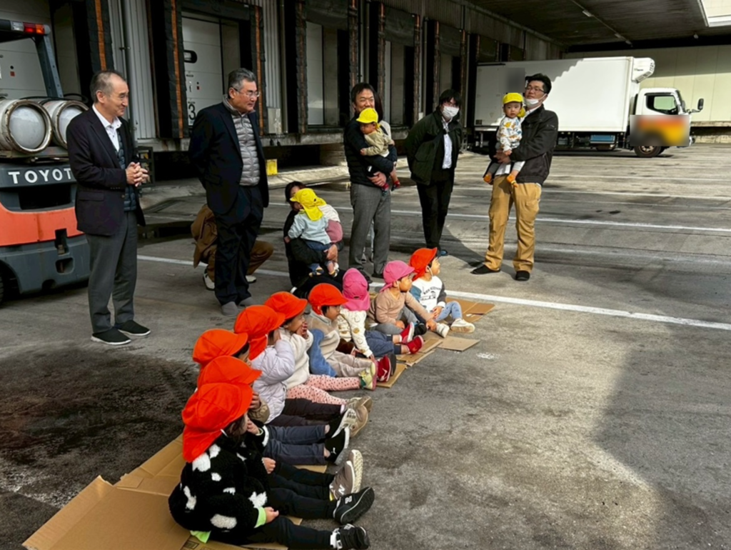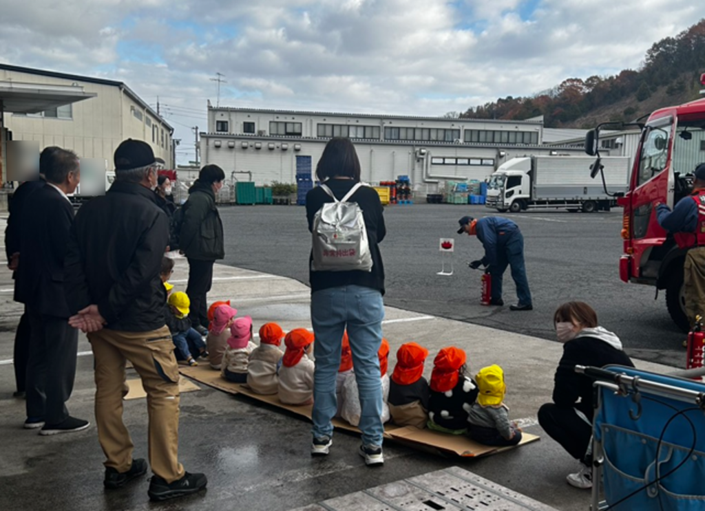 社屋内で火事が発生したという想定のもと、我が社の社員たちも保育園児さんを抱っこして微力ながら避難訓練のお手伝いをさせて頂きました。