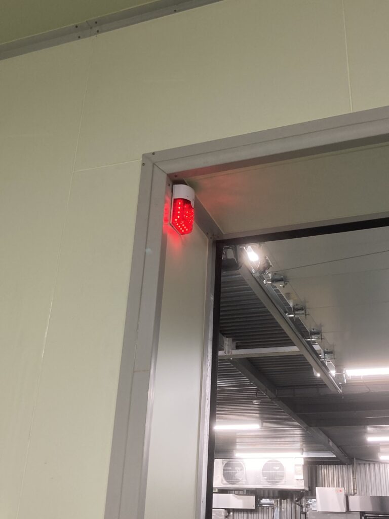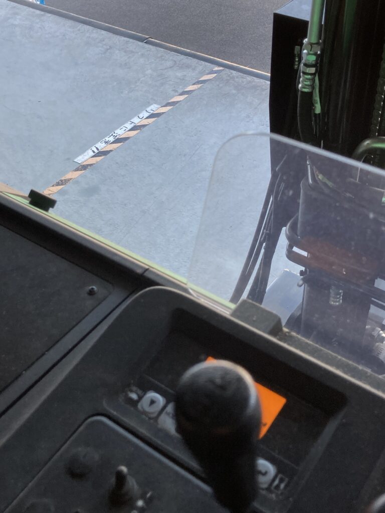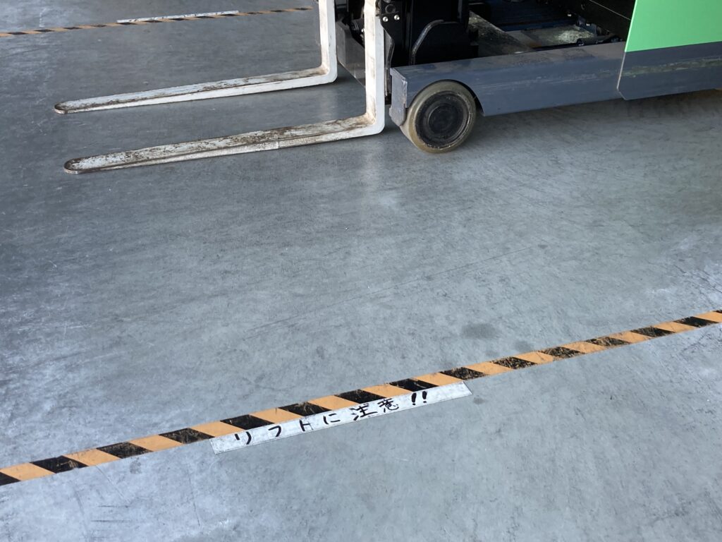 そして、庫内においてはフォークリフト運行時の接触事故を防ぐための「歩行者接触防止ブザー」設置とフォークリフトの存在を周知するための「リフトに注意!!」の文言を設置しました。