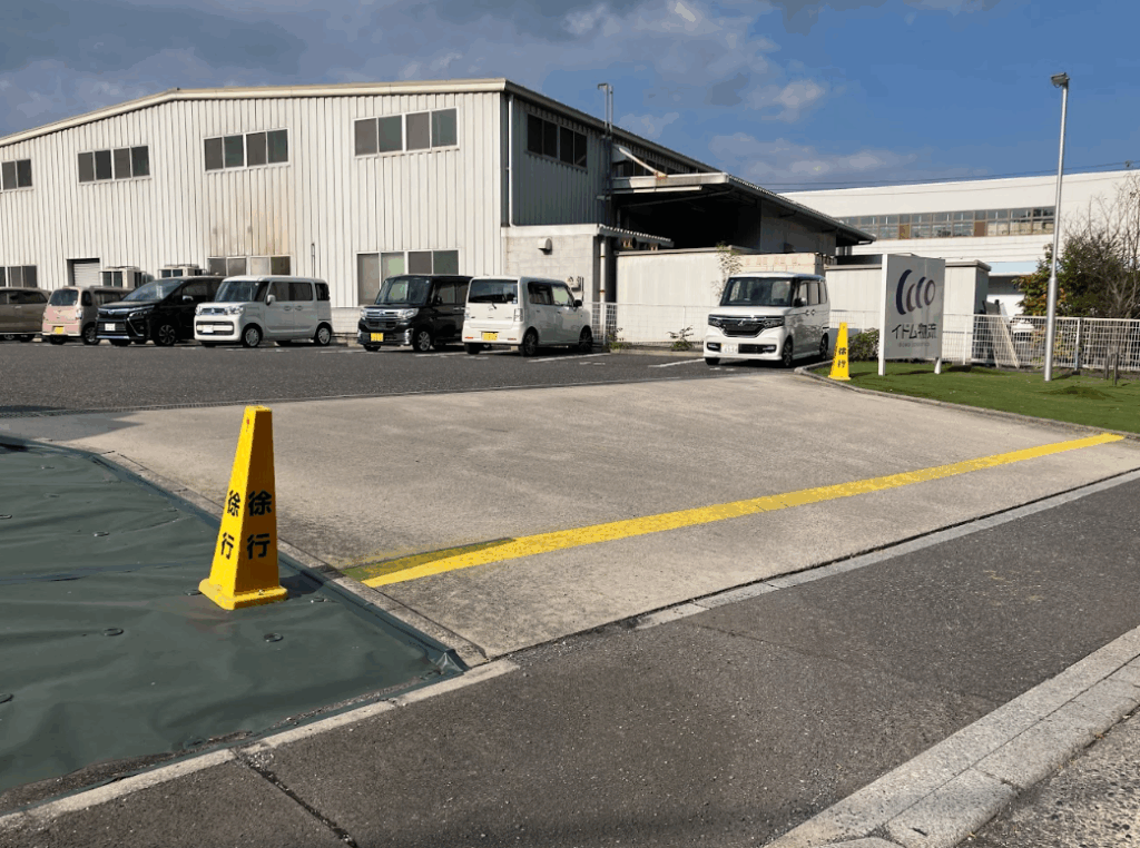 また、本社駐車場構内では、徐行運転を促すために駐車場への出入りの際に目安としての「止まれ&徐行」と「停止ライン」を設置しました。