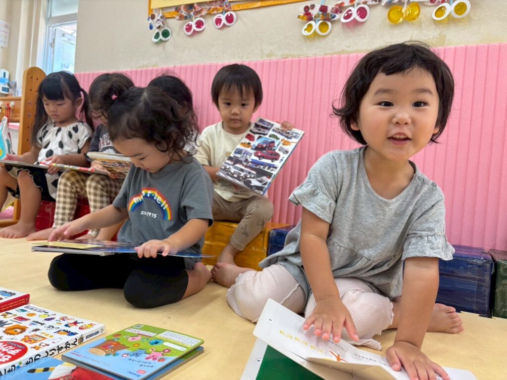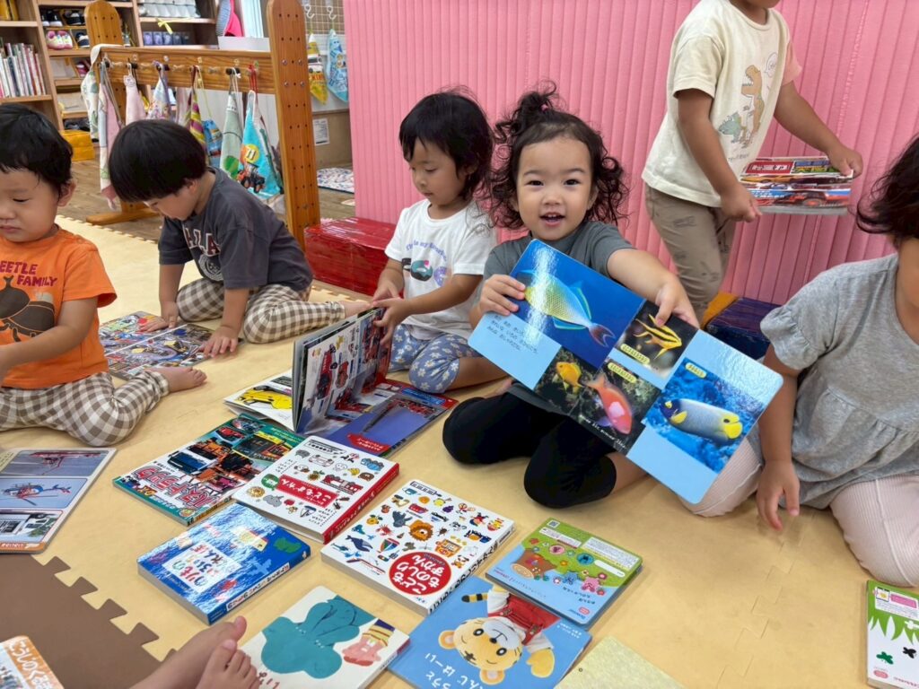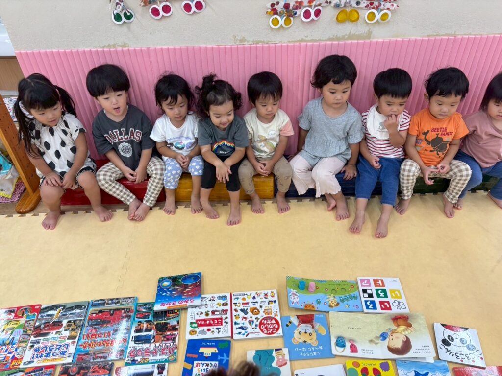 園児さんたちの前にズラリと並べてみると・・・早く絵本を手にしたくてみんなワクワクが止まりません!