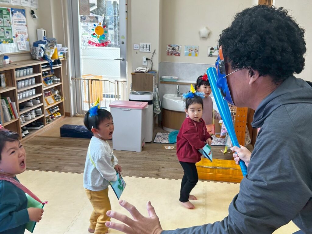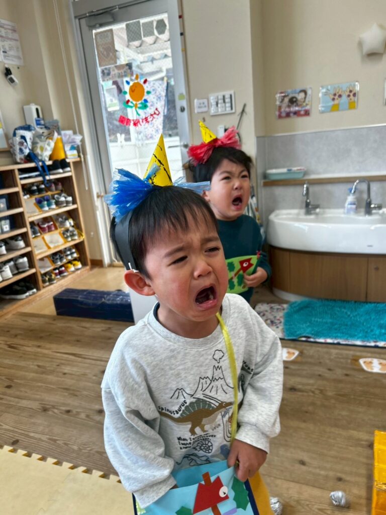 泣き叫びながら逃げ惑う園児さんもいれば、先生にしがみついて離れない園児さんも。大きい子たちは怯えながらも果敢に鬼に向かってお手製の豆(新聞紙を丸めて作ったようです)を投げていました!