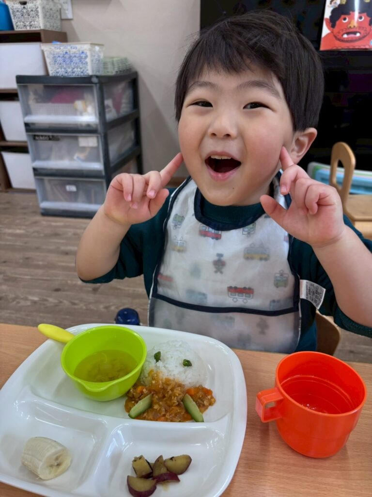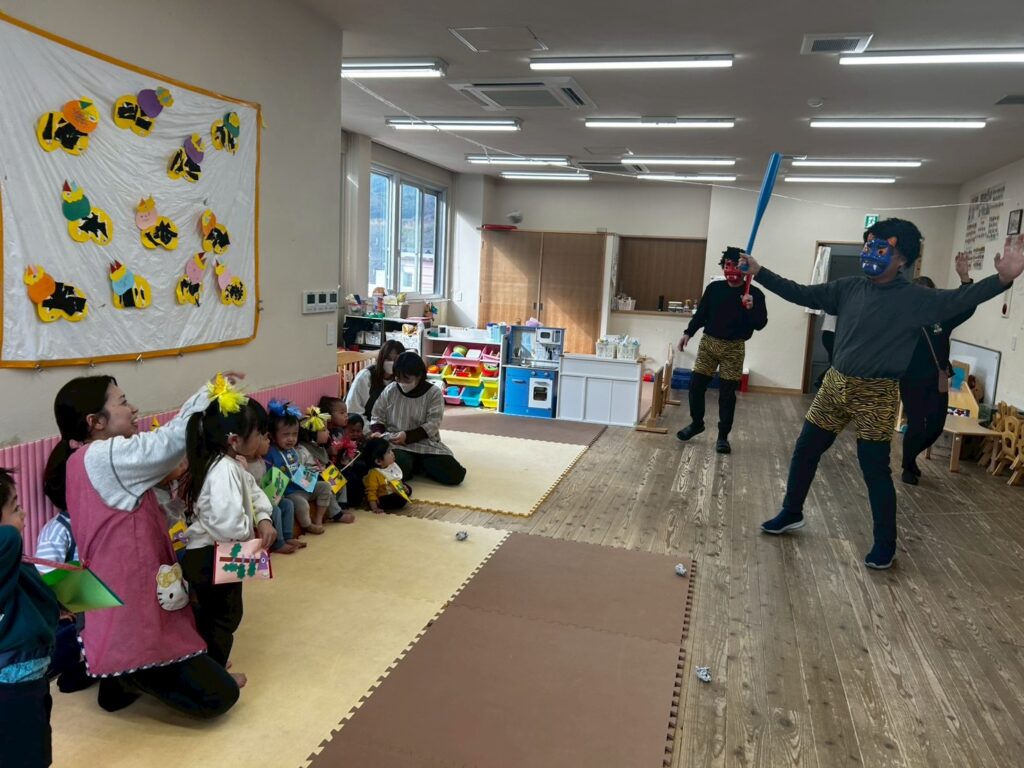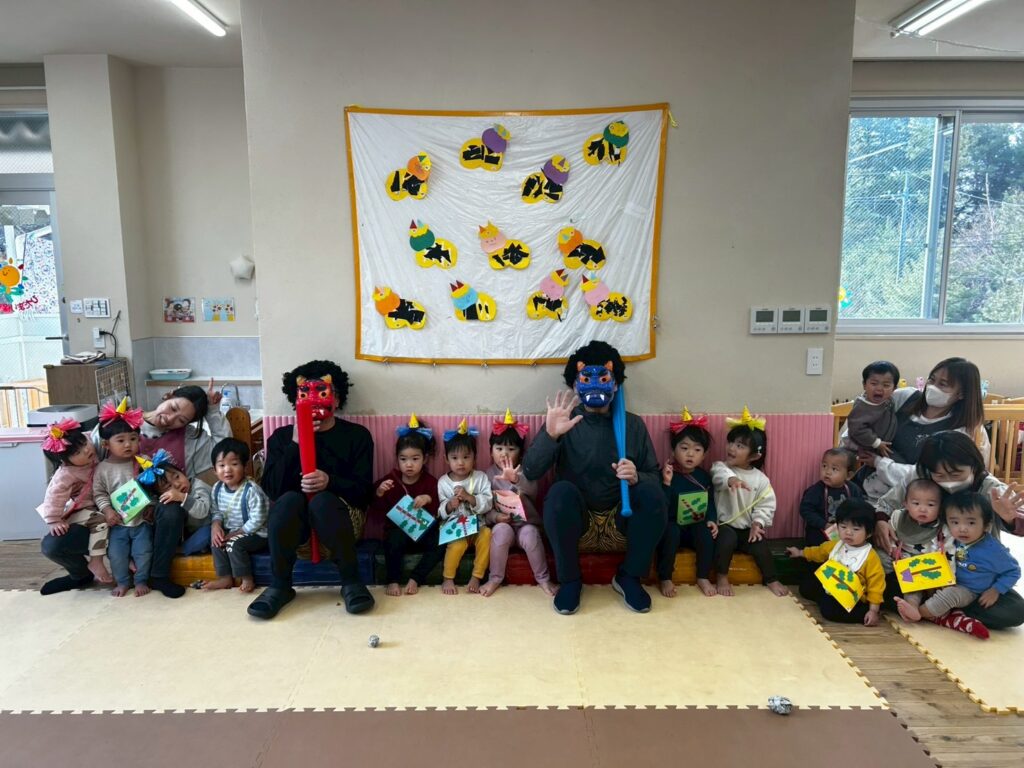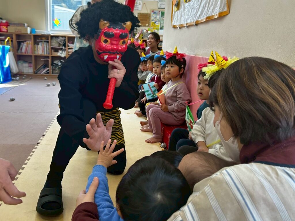 最後に赤鬼・青鬼からお菓子のプレゼントです。すっかり仲良くなったようで、笑顔でハイタッチしながら赤鬼・青鬼は穏やかに見送られ保育園を後にしました…。この日の保育園給食は鬼豆ライスで、園児さんたち、ペロリと平らげたそうです。